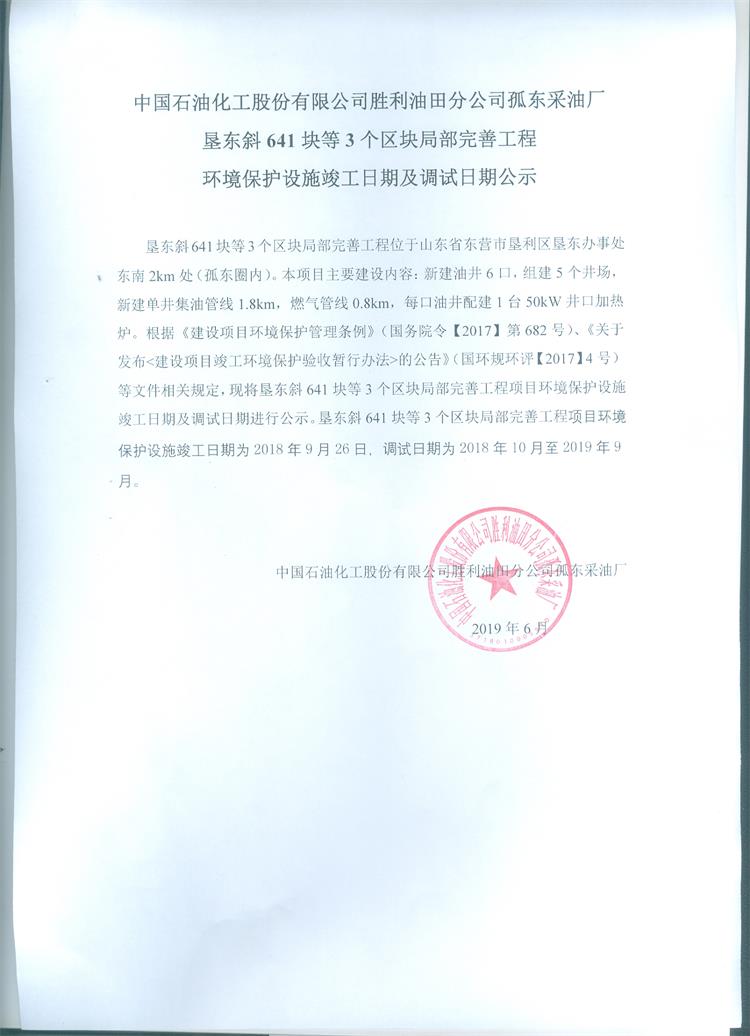 中國石油化工股份有限公司勝利油田分公司孤東采油廠墾東斜641塊等3個區(qū)塊局部完善工程環(huán)境保護設(shè)施竣工日期及調(diào)試日期公示