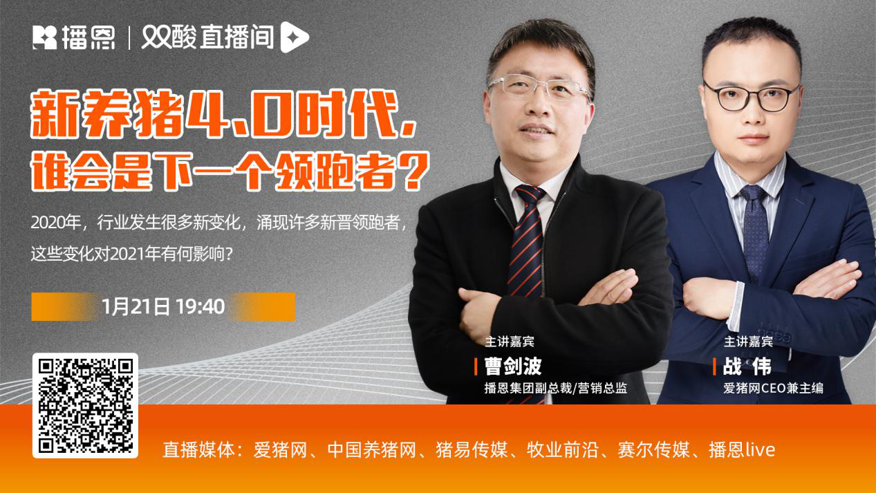 1月21日晚19:40,播恩雙酸直播間2021開年直播如期而至,這期的主題是——“養(yǎng)豬新4.0時代,誰會是下一個領(lǐng)跑者”。此次直播,特別邀請了播恩集團(tuán)副總裁/營銷總監(jiān)曹劍波與愛豬網(wǎng)CEO/主編戰(zhàn)偉兩位行業(yè)大咖做客直播間,以訪談式直播為方式,交流農(nóng)牧話題。兩位嘉賓從2020年行業(yè)現(xiàn)象著手,高度凝練2020的挑戰(zhàn)與收獲,進(jìn)而思考2021年豬業(yè)趨勢……攜農(nóng)牧朋友告別2020,共同迎接2021年辛丑金牛年。