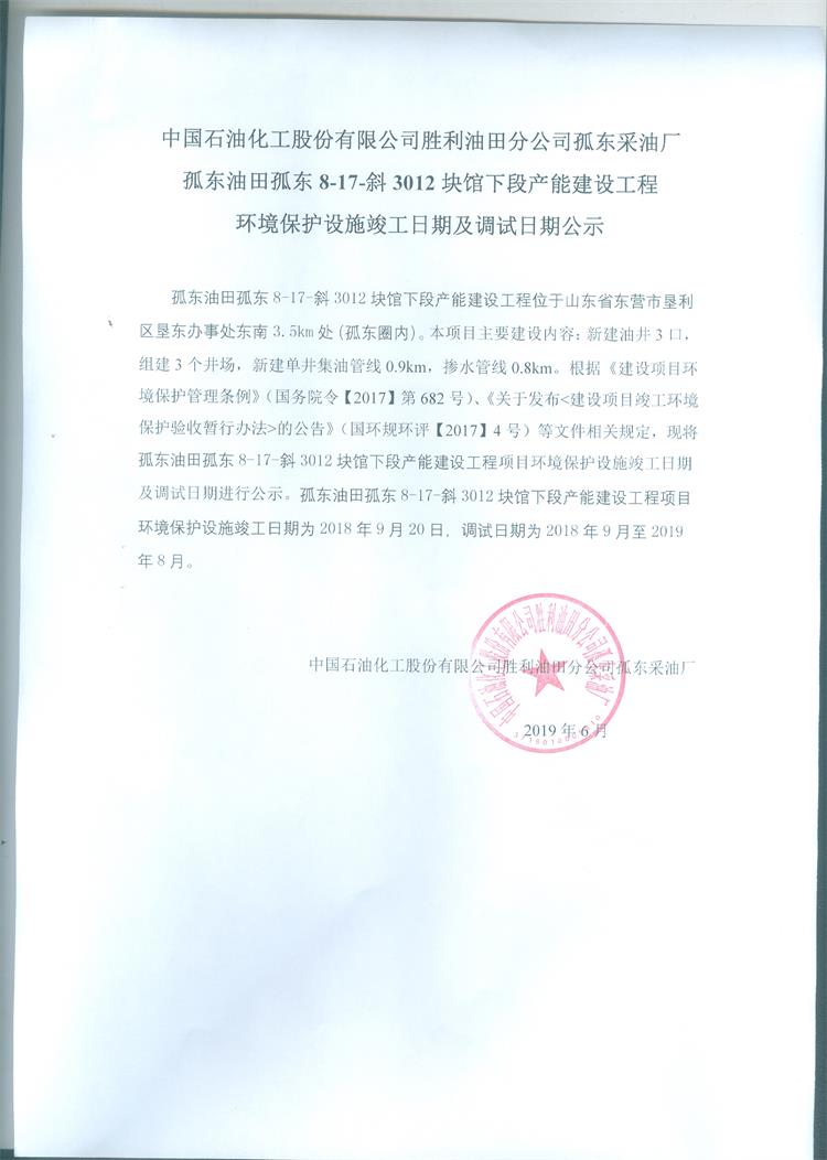 中國石油化工股份有限公司勝利油田分公司孤東采油廠孤東油田孤東8-17斜3012塊館下段產(chǎn)能建設工程環(huán)境保護設施竣工日期及調試日期公示